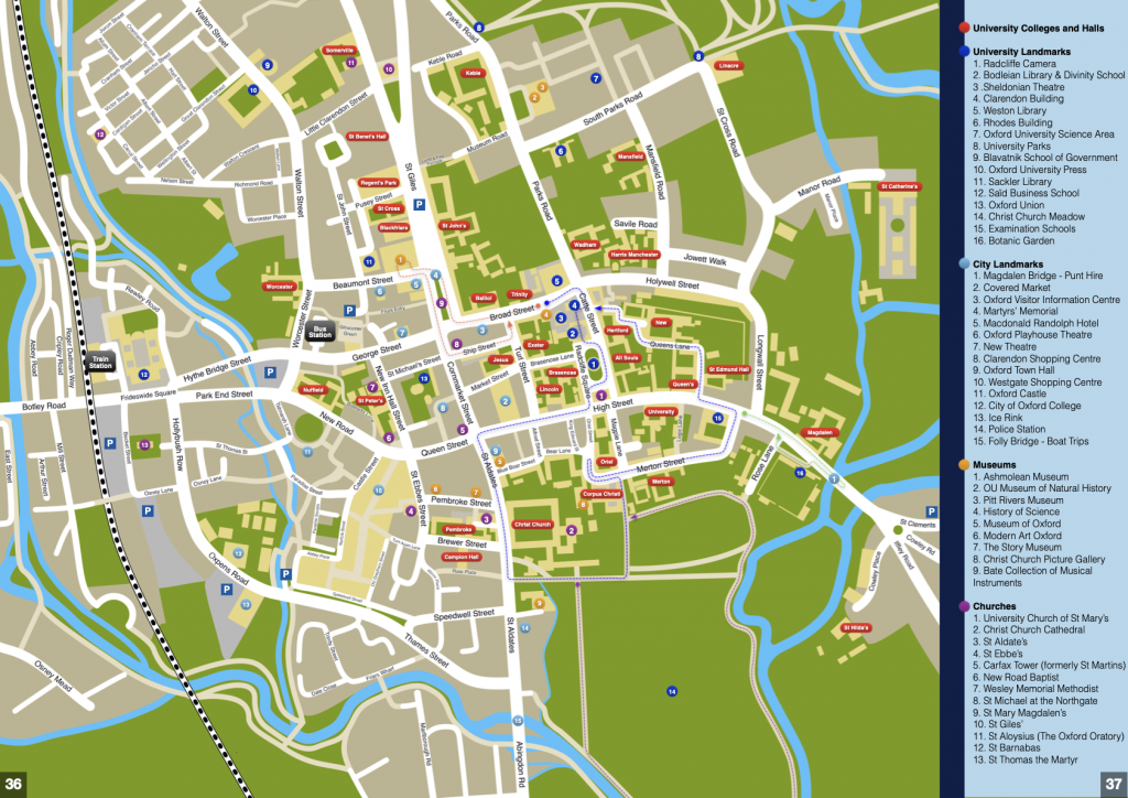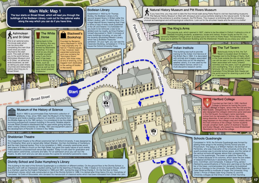 Having lived in Oxford for nearly all my life, and often having friends to visit, I always found myself trying to find optimal routes around Oxford to take them to see the main sights when we didn’t have very much time. Despite there being no shortage of guidebooks of Oxford, my experience is that they tended to contain pages and pages of dense information. I generally found them too much to digest, and impractical to read when you actually want the information, i.e when you are on the street looking at something of interest, that’s assuming you know what building you are looking at to be able to look it up. It got me wondering: if I were to make an Oxford guide book, how would I do it?